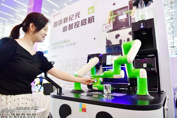 剛走進展館,一臺機器人咖啡機便吸引了記者眼球。記者在屏幕下單后,便可以看到機器人制作一杯咖啡的全過程。機器人舞動機械手臂,完成咖啡豆研磨、取杯、加水等連續(xù)動作,50秒后,一杯現(xiàn)磨咖啡就新鮮出爐了。