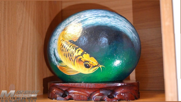 這些多姿多彩的石畫均出自張霞之手,她自幼愛好繪畫。6年前一次郊游,她在涪江河灘拾得幾枚形態(tài)好看的石頭,于是帶回家。閑暇時,張霞把玩這些石頭,靈感油然而生:“何不在石頭上繪畫呢?”