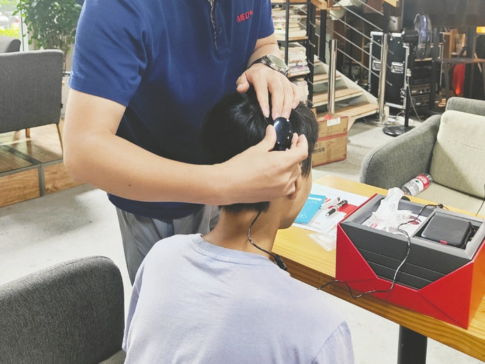 “現(xiàn)在有聲音嗎?”“有!”7月29日,美笛樂聽力植入技術(shù)服務(wù)有限公司四川辦事處專業(yè)技術(shù)人員黃良威來到綿陽,為丟失人工耳蝸的少年小峰(化名)佩戴上了新外機(jī),并教小峰如何使用和保養(yǎng)。