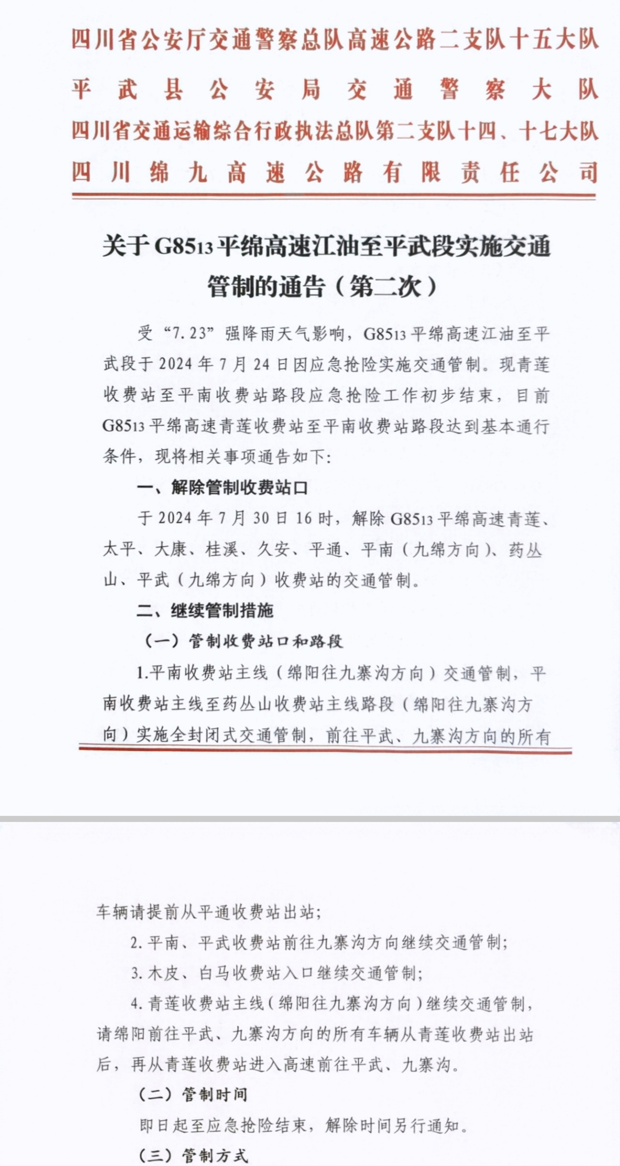 1.平南收費(fèi)站主線(綿陽往九寨溝方向)交通管制,平南收費(fèi)站主線至藥叢山收費(fèi)站主線路段(綿陽往九寨溝方向)實(shí)施全封閉式交通管制,前往平武、九寨溝方向的所有車輛請(qǐng)?zhí)崆皬钠酵ㄊ召M(fèi)站出站;