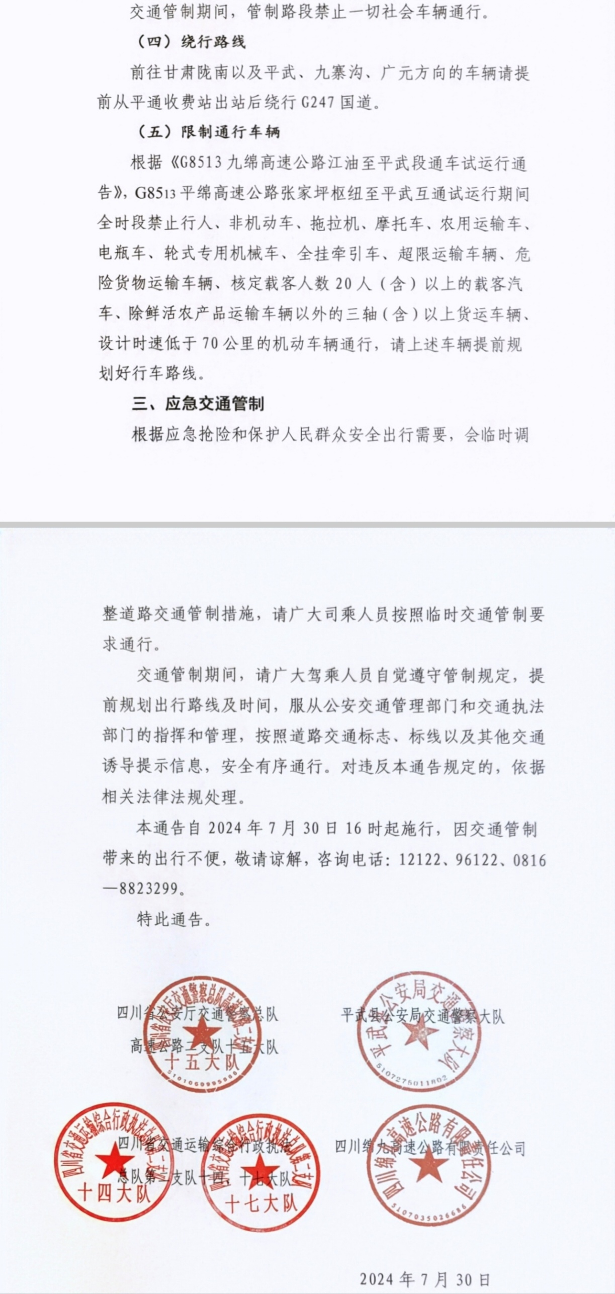 交通管制期間,管制路段禁止一切社會(huì)車輛通行。前往甘肅隴南以及平武、九寨溝、廣元方向的車輛需提前從九綿高速平通收費(fèi)站出站后繞行G247國道。