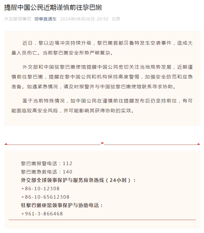 外交部和中國駐黎巴嫩使館提醒中國公民密切關(guān)注當(dāng)?shù)鼐謩莅l(fā)展,近期謹(jǐn)慎前往黎巴嫩,提醒在黎中國公民和機(jī)構(gòu)保持高度警惕,加強(qiáng)安全防范和應(yīng)急準(zhǔn)備。如遇緊急情況,請及時報警并與中國駐黎巴嫩使館聯(lián)系尋求協(xié)助。