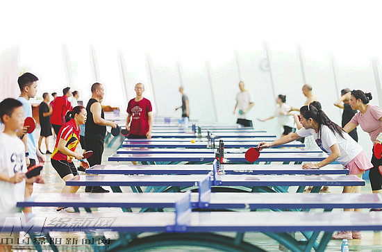 在南河體育中心,市民在乒乓球臺前盡情揮灑汗水(記者 陳冬冬 攝)