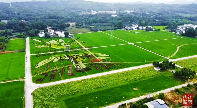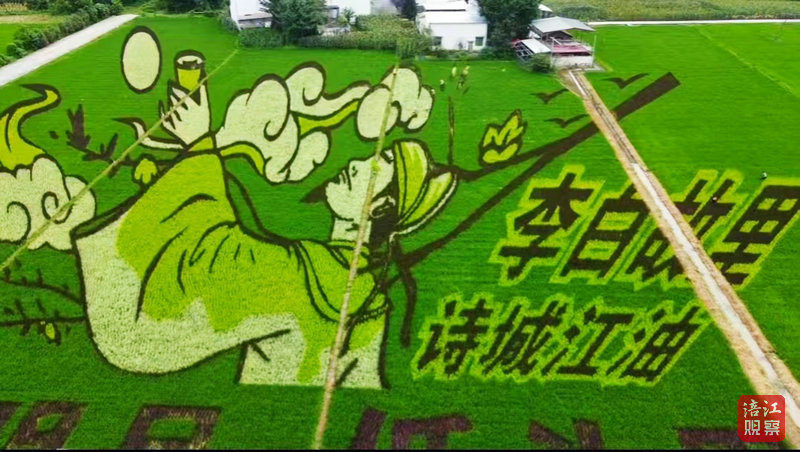 放眼望去,一望無垠的田野上既有“李白月下飲酒”“推廣農(nóng)業(yè)機(jī)械”“國寶熊貓”等彩色圖案,又有“李白故里、詩城江油”“鄉(xiāng)村振興、星火先行”等文字。