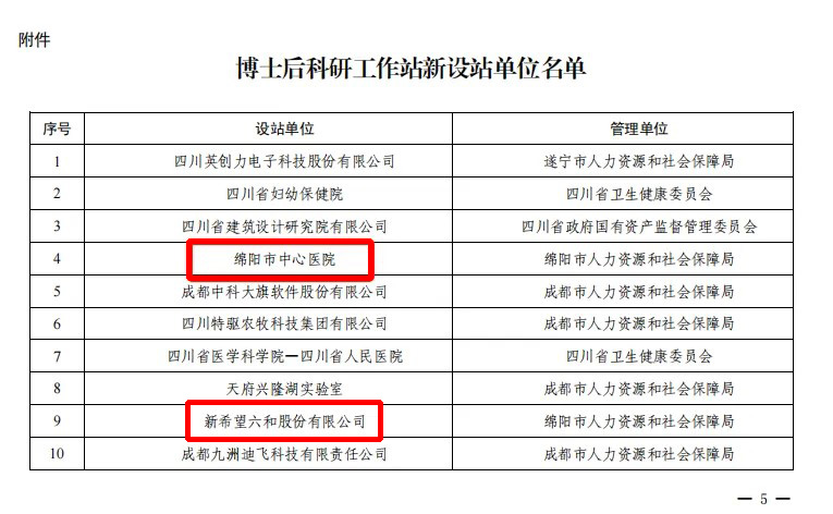 近日,四川省人社廳發(fā)布獲批新設(shè)博士后科研工作站名單,綿陽市的市中心醫(yī)院、新希望六和股份有限公司2家單位名列其中,將分別獲省、市資助資金60萬元。其中,綿陽所入選單位數(shù)量在地級市中排名第一。