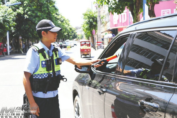 8月13日中午,安州城區(qū)益昌東路路口,交警頭頂烈日對過往車輛進(jìn)行例行檢查,不到半小時(shí),汗水便濕透了警服。