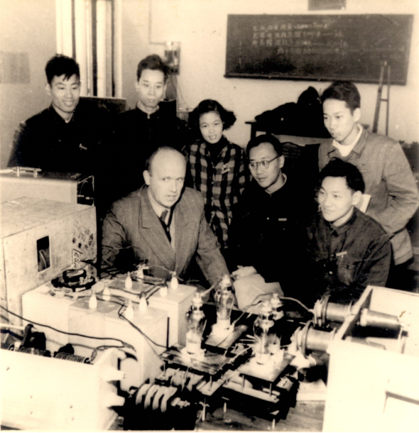 第二張照片是該校劉盛綱院士和“兩彈元?jiǎng)?rdquo;鄧稼先、王淦昌、程開(kāi)甲的合影。上世紀(jì)七十年代后期,我國(guó)開(kāi)始秘密研制“閃光一號(hào)”電子束加速器,即給核武器電子元器件做“體檢”的機(jī)器。從設(shè)計(jì)到加工、安裝、調(diào)試,劉盛綱與各位元?jiǎng)讉冊(cè)陔[秘山區(qū)艱苦奮斗六七年。1981年,加速器成功建成,兩年后通過(guò)國(guó)家鑒定,在核武器研制中大放異彩。之后,劉院士一直勇立世界科技潮頭,而他對(duì)自己的成就淡然處之,始終心懷熾熱,追光而行。