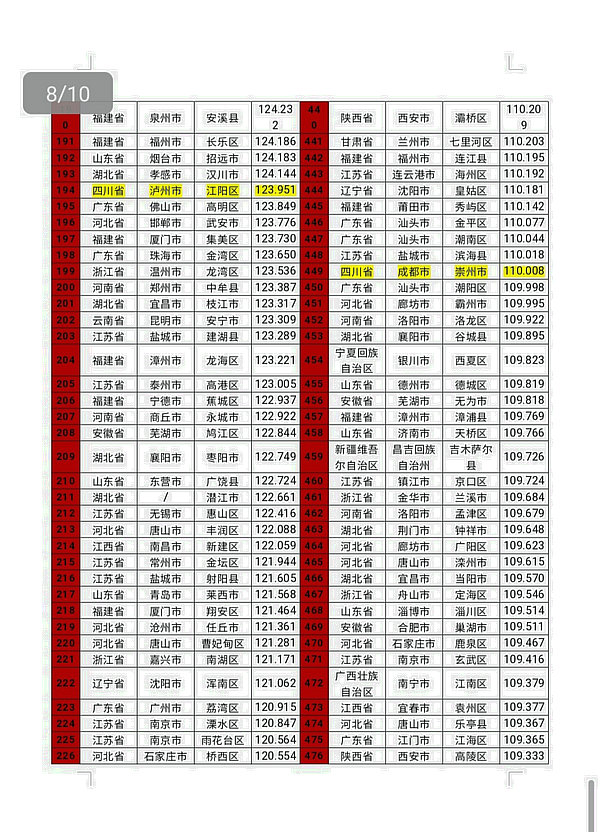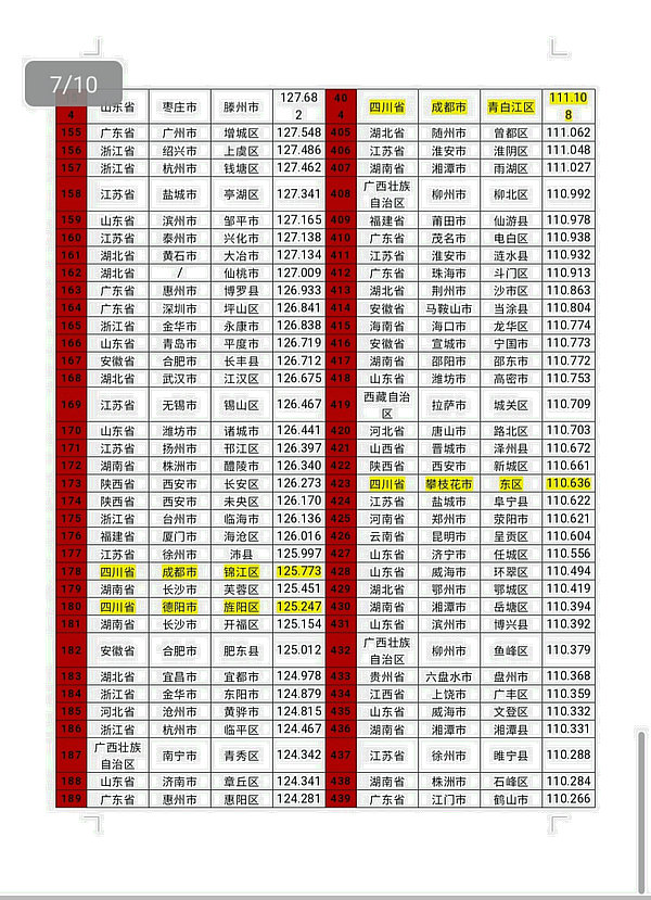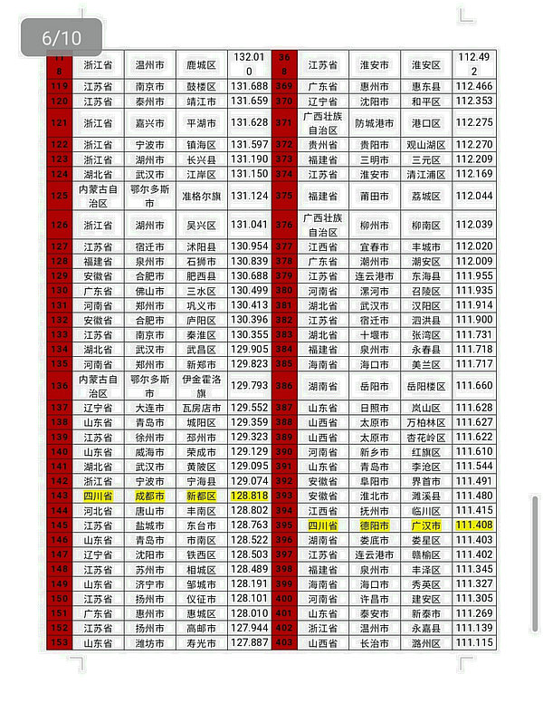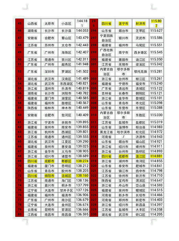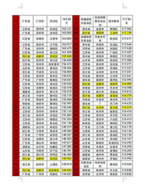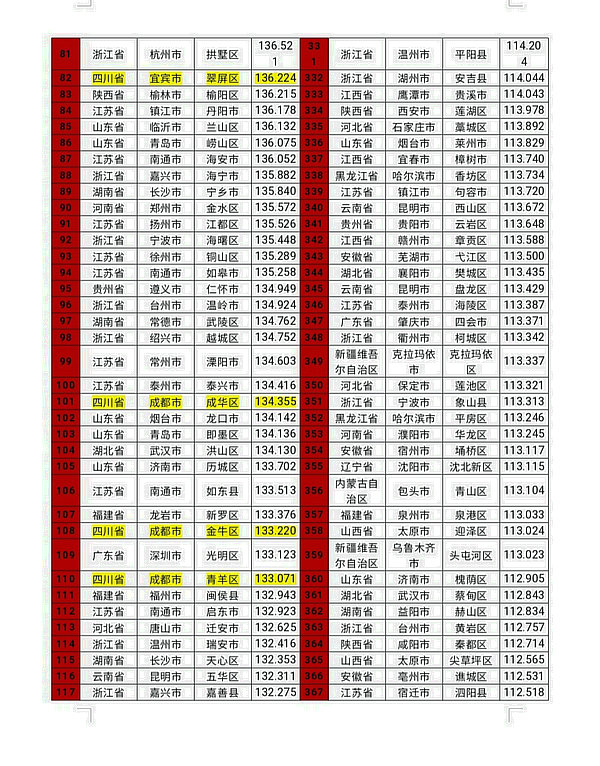 四川上榜的26個(gè)縣(市、區(qū))分布在10個(gè)地級(jí)行政區(qū)劃單位,分別是成都市(上榜全國(guó)100強(qiáng)4個(gè)、上榜全國(guó)500強(qiáng)15個(gè))、綿陽(yáng)市(上榜全國(guó)100強(qiáng)1個(gè)、上榜全國(guó)500強(qiáng)2個(gè))、德陽(yáng)市(上榜全國(guó)500強(qiáng)2個(gè))、宜賓市(上榜全國(guó)100強(qiáng)1個(gè)、上榜全國(guó)500強(qiáng)1個(gè))、達(dá)州市(上榜全國(guó)500強(qiáng)1個(gè))、涼山彝族自治州(上榜全國(guó)500強(qiáng)1個(gè))、瀘州市(上榜全國(guó)500強(qiáng)1個(gè))、眉山市(上榜全國(guó)500強(qiáng)1個(gè))、攀枝花市(上榜全國(guó)500強(qiáng)1個(gè))、遂寧市(上榜全國(guó)500強(qiáng)1個(gè))。
