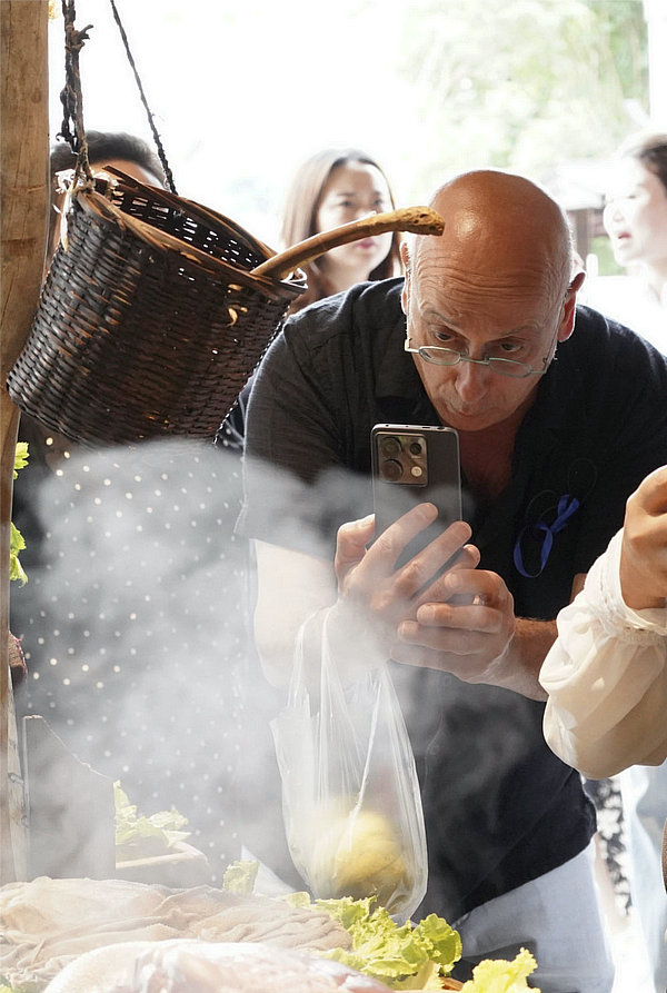 外國游客在四川旅游途中拍攝美食(6月7日攝)。新華社記者 張超群 攝