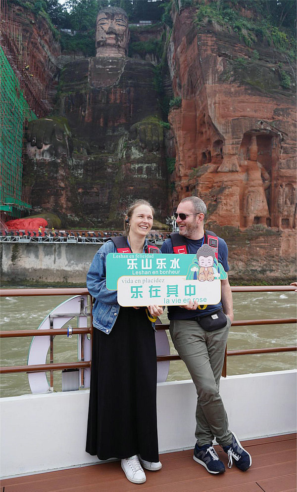 外國游客在四川樂山乘船游覽樂山大佛(6月7日攝)。新華社記者 張超群 攝