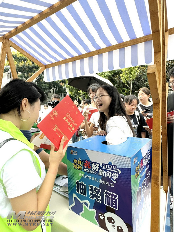 在“禮好,新同學(xué)”綿陽師范學(xué)院活動現(xiàn)場,記者看到,不少大一新生正在排隊抽取盲盒大禮包,里面包含綿陽米粉、“邱小姐”模型、熊貓文創(chuàng)包裝袋、雪寶乳品、梓潼文創(chuàng)雪糕等極具綿陽特色的產(chǎn)品。