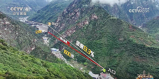 而在最早的設(shè)計(jì)勘察時(shí),該路段高差太大,也就是隧道進(jìn)、出口直線距離僅1600米,高度差卻有213米。如果按照這種高度修建直線隧道,坡度將高達(dá)13。3%,這將遠(yuǎn)遠(yuǎn)超過(guò)高速公路設(shè)計(jì)最大縱坡6%的坡度要求。如何解決這一問(wèn)題呢?