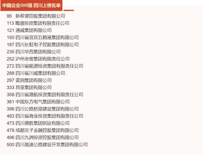 9月11日,中國企業(yè)聯(lián)合會、中國企業(yè)家協(xié)會發(fā)布“2024中國企業(yè)500強(qiáng)”榜單,四川共有19家企業(yè)上榜,較上年新增4家入圍企業(yè),是新增企業(yè)數(shù)量最多的省份。