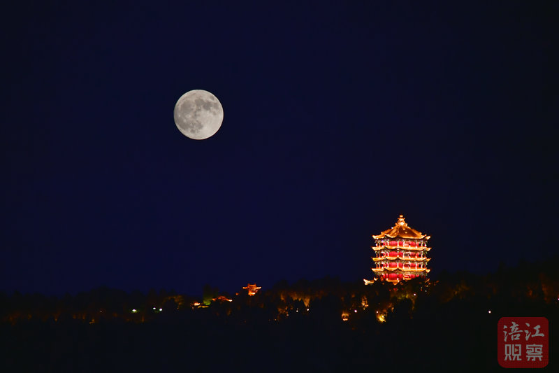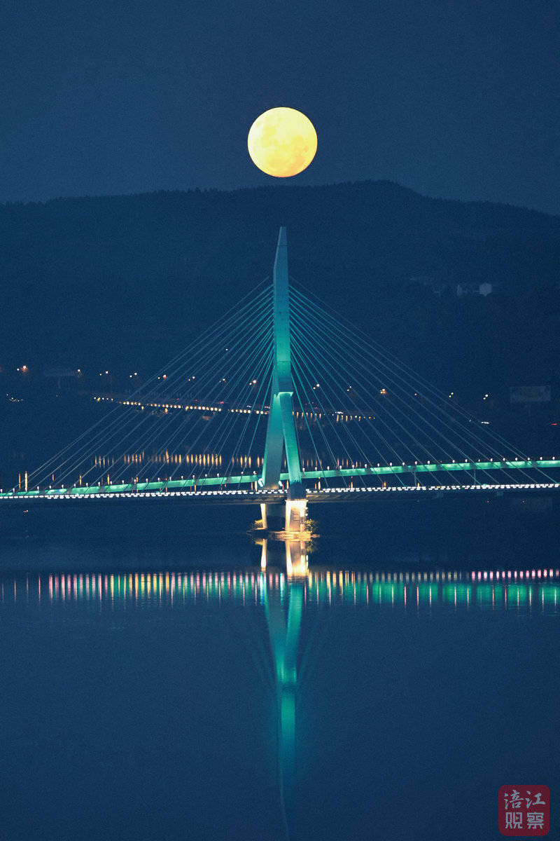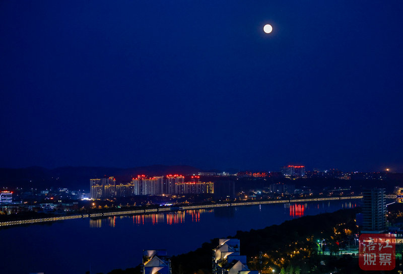 ↑9月17日晚,城區(qū)三江大壩上空的滿月。視覺(jué)綿陽(yáng) 謝江平/攝