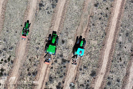 6月15日,在地處黃河“幾字彎”的內(nèi)蒙古庫布其沙漠防沙治沙項(xiàng)目區(qū),工人駕駛牽引播種機(jī)種檸條(無人機(jī)拍攝)。新華社記者 李云平 攝