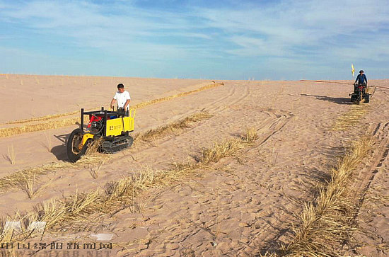 6月16日,內(nèi)蒙古巴彥淖爾市烏拉特后旗西補(bǔ)隆林業(yè)管護(hù)中心職工駕駛機(jī)械壓沙障。新華社記者 李云平 攝