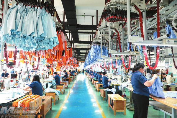 在大多數(shù)人印象中,服裝紡織行業(yè)屬于傳統(tǒng)工業(yè)中的勞動(dòng)密集型產(chǎn)業(yè)。然而,記者在現(xiàn)場(chǎng)看到,第四車(chē)間已經(jīng)引入了一條自動(dòng)智能吊掛生產(chǎn)線(xiàn),上一個(gè)環(huán)節(jié)的工人只需把半成品掛到吊掛機(jī)上,就自動(dòng)運(yùn)輸?shù)较乱粋€(gè)工序進(jìn)行下一步的生產(chǎn)。