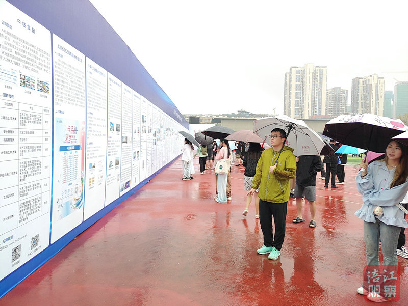 上午9時30分許,啟動儀式舉行,隨后招聘會正式開始。秋雨淅瀝中,各高校的學(xué)子撐著雨傘,穿過人群,來到心儀企業(yè)的展臺前,有序排隊遞簡歷。