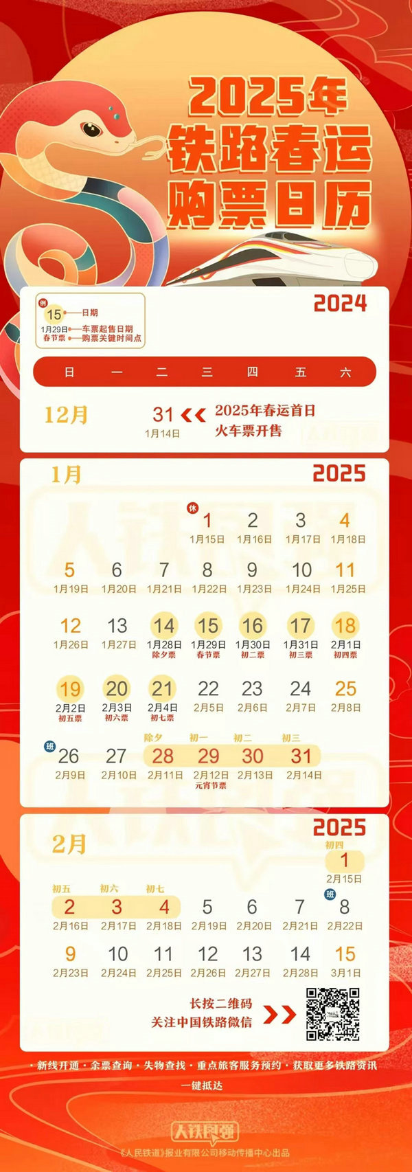 2025年鐵路春運(yùn)自2025年1月14日開始,至2月22日結(jié)束,為期40天。全國鐵路預(yù)計(jì)發(fā)送旅客5.1億人次,節(jié)前客流高峰日預(yù)計(jì)為1月25日(臘月廿六),節(jié)后客流高峰日預(yù)計(jì)為2月4日(正月初七)。