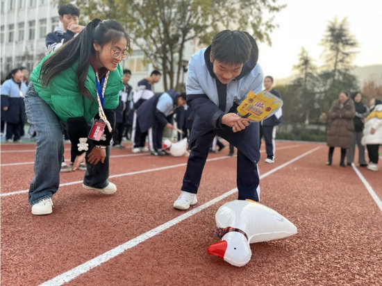 賽場(chǎng)師勇奮爭(zhēng)先,團(tuán)結(jié)共筑樂(lè)無(wú)邊。在同學(xué)們自覺(jué)的歡呼聲中,在如茵跑道上,參賽教師們?nèi)珉x弦之箭,身姿矯健,青春再現(xiàn)。他們目光堅(jiān)定,緊盯著鴨;他們擺臂有力,狂扇鴨;他們步伐沉穩(wěn),疾逐鴨。教師們?cè)跉g笑中,揮灑汗水,詮釋拼搏與團(tuán)結(jié)的精神!