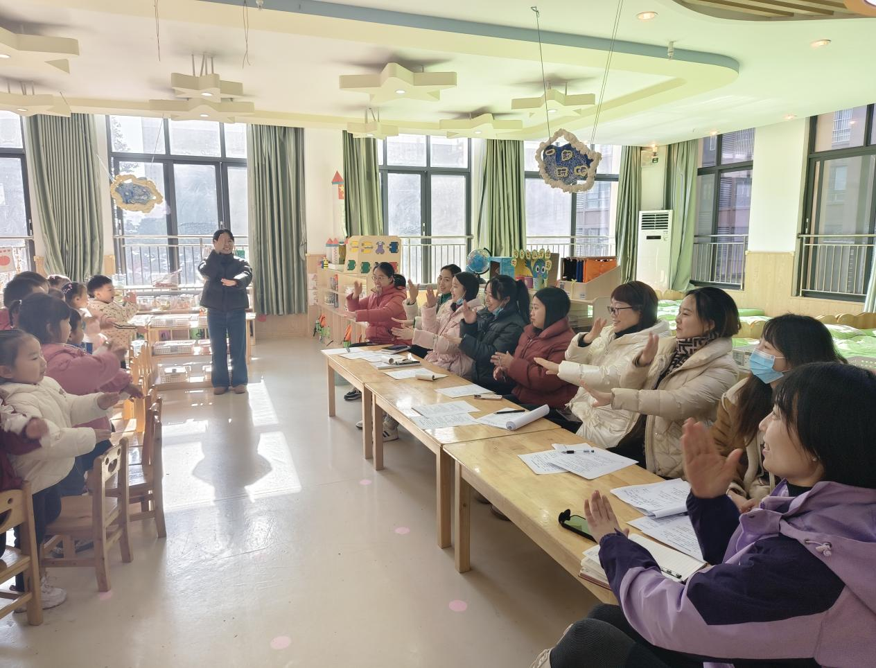 活動(dòng)當(dāng)天,上午時(shí)段,中青年教師馮芹與汪麗娟分別在中一班和中二班開(kāi)展了區(qū)域游戲活動(dòng)。她們緊密圍繞當(dāng)前主題,投放了多元化的材料,引導(dǎo)幼兒通過(guò)分組計(jì)劃、討論、實(shí)施及回顧等環(huán)節(jié),自主選擇、沉浸探究,滿足個(gè)性化需求。教師們細(xì)心觀察、認(rèn)真記錄,并在適宜時(shí)機(jī)介入指導(dǎo),助力幼兒在游戲中成長(zhǎng)。隨后,杜景晨老師的音樂(lè)活動(dòng)《中國(guó)拉面館》,通過(guò)生動(dòng)的表演和歡快的節(jié)奏,讓孩子們感受到了音樂(lè)的無(wú)限魅力。