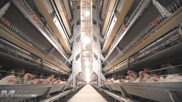 雞舍里,一排排標(biāo)準(zhǔn)化層疊式蛋雞籠整齊排列著,隨著全自動化飼養(yǎng)系統(tǒng)啟動,飼料均勻地撒在食槽內(nèi),成千上萬只蛋雞競相啄食,不時有雞蛋滾進(jìn)食槽下方的收蛋槽內(nèi)。