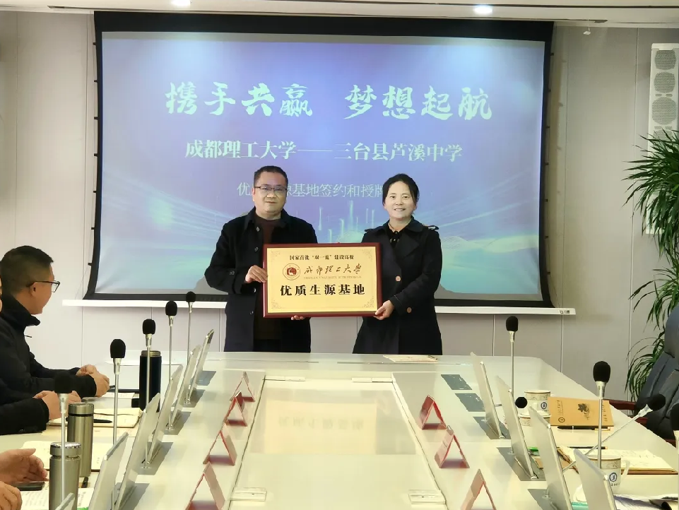 2025年1月13日,成都理工大學在三臺縣蘆溪中學隆重舉行了以“雙向奔赴,合作共贏”為主題的“優(yōu)質生源基地”簽約授牌儀式。成都理工大學招生就業(yè)處處長陳國華一行5人,三臺縣教體局黨組成員胡運軍,蘆溪中學黨委書記任雙全,黨委副書記、副校長尹家兵參加儀式。