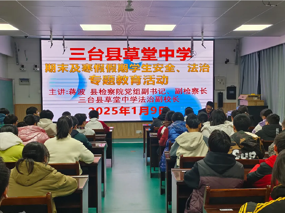 為了進一步加強學生的安全教育和法治保護,確保全體師生度過一個平安、快樂的寒假和春節(jié),2025年1月9日,三臺縣草堂中學邀請了三臺縣檢察院黨組副書記、副檢察長、學校法治副校長蔣波走進校園,開展了以“快樂假期,安全、法治同行”為主題的2024年秋安全、法治教育講座活動。