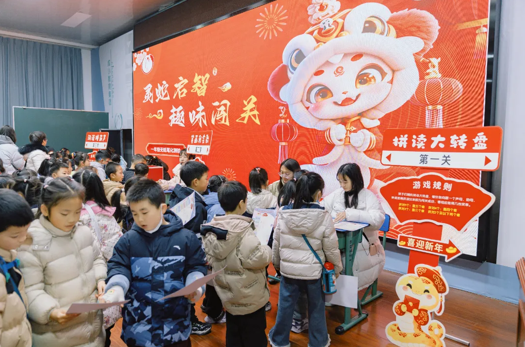 語文主場上,整齊排列在“拼讀大轉(zhuǎn)盤”處的孩子們揮舞著小手,靈活地轉(zhuǎn)動著大轉(zhuǎn)盤,看著指針指向的地方快速熟練地拼讀出聲母和韻母;“筆畫我會數(shù)”這一關(guān),大家滿懷期待地從盲盒中抽取字卡,接著大膽自信地數(shù)出生字筆畫;“詞語糖葫蘆”給孩子們準備了精美的“糖葫蘆詞語串”,闖關(guān)的“勇士”們隨機抽取一串糖葫蘆,準確地認讀葫蘆上的詞語,闖關(guān)成功后的印章可比糖葫蘆還要甜蜜;另一關(guān),孩子們化身神奇的小小魔法師,親自開啟“魔法書”,聲情并茂地背誦書中的兒歌課文咒語。幾個關(guān)卡有效檢驗了學(xué)生對本學(xué)期語文知識的掌握程度。