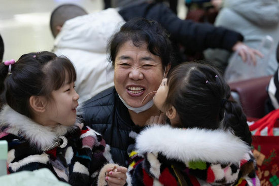 1月14日,在哈爾濱火車站候車大廳,小朋友和姥姥一起吃東西。她們從黑龍江省牡丹江市去往海南省海口市過(guò)年。新華社記者 張濤 攝