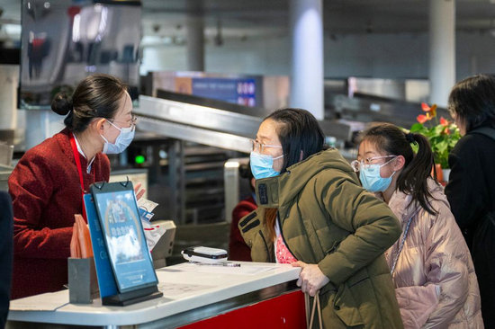 1月14日,在武漢市天河機(jī)場(chǎng),旅客在辦理值機(jī)。新華社記者 伍志尊 攝