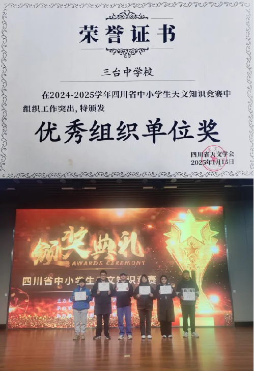 2025年1月19日,四川省中小學(xué)生天文知識(shí)競(jìng)賽頒獎(jiǎng)儀式在成都舉行。三臺(tái)中學(xué)12名師生榮獲省級(jí)獎(jiǎng)勵(lì),學(xué)校榮獲優(yōu)秀組織單位獎(jiǎng)。
