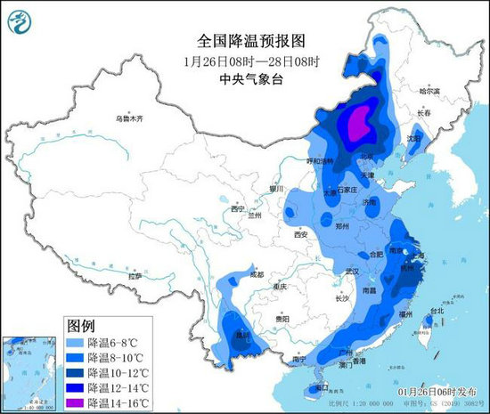 預(yù)計,1月26日08時至28日08時,內(nèi)蒙古中東部、西北地區(qū)東北部、華北大部、黃淮、江淮、江南中東部、華南中東部、云南中東部、川西高原南部等地氣溫將下降6~10℃,其中,內(nèi)蒙古中東部的部分地區(qū)降溫幅度可達12℃以上。