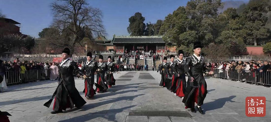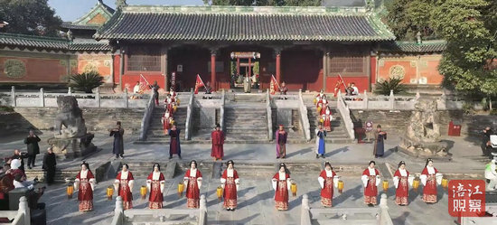 隨后,一眾演員拜謝“四恩”,拾階而下,來到報恩寺廣場中心位置。禮樂齊鳴,“明代”仕女翩翩起舞,一瞬間仿佛帶人穿越到了幾百年前的風華大明。
