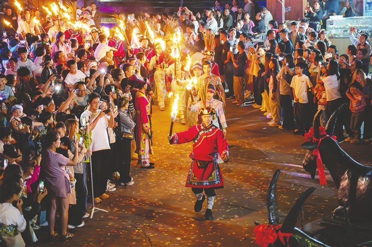 在北川九皇山景區(qū),薩朗狂歡節(jié)吸引眾多市民游客參與其中。(記者 唐云峰 攝)