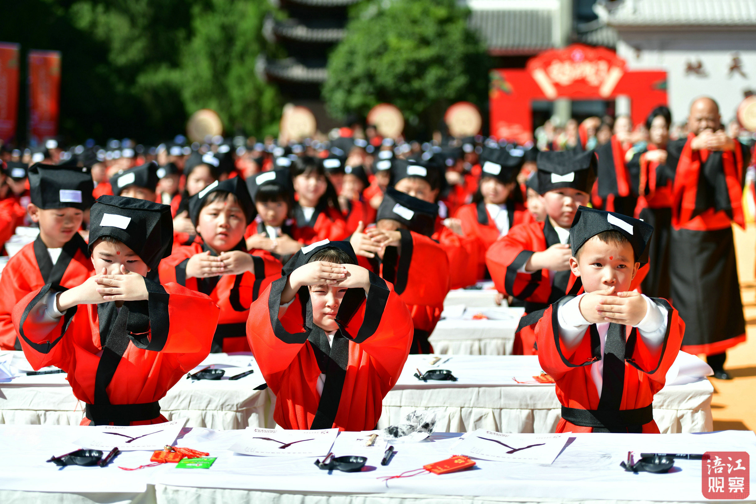 隨后,還進(jìn)行了啟蒙描紅·學(xué)做人、詠頌經(jīng)典·明古訓(xùn)、感恩鞠躬·記恩情、祈福題牌·承宏愿等環(huán)節(jié)。