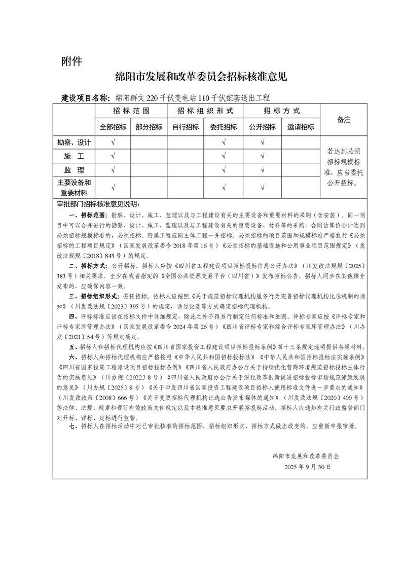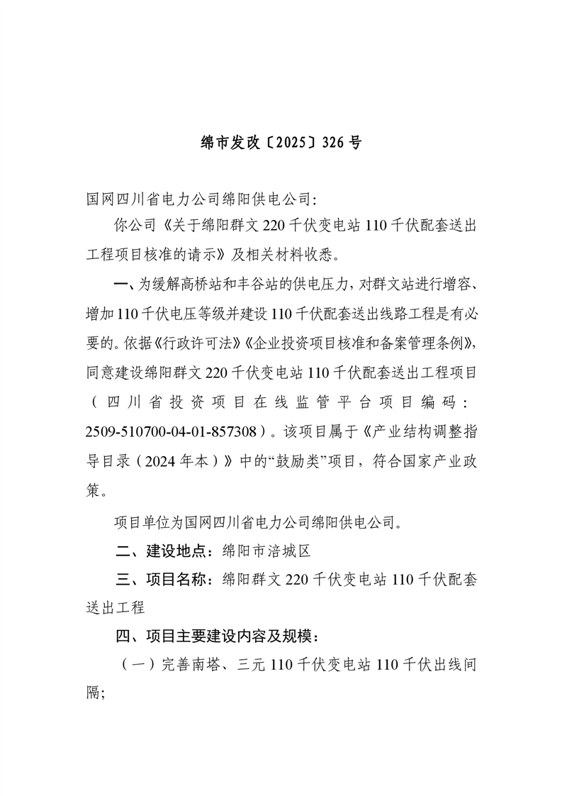 綿陽(yáng)市發(fā)展和改革委員會(huì)關(guān)于綿陽(yáng)群文220千伏變電站110千伏配套送出工程項(xiàng)目核準(zhǔn)的批復(fù)