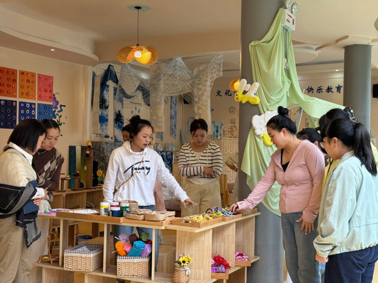 在黨支部副書記薛梅的帶領(lǐng)下,行政團隊與全體教師深入各班,對扎染、面塑、造紙等八大非遺區(qū)角進行現(xiàn)場觀摩與研討。