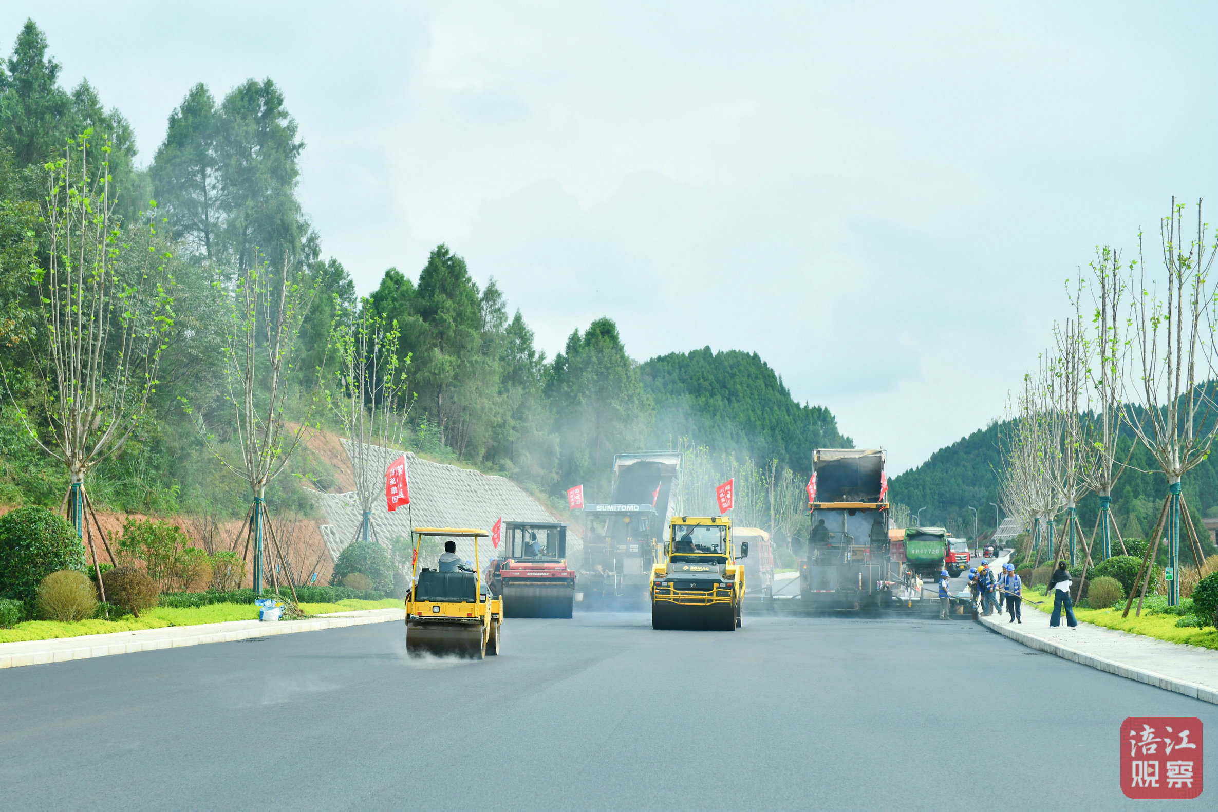 攤鋪現(xiàn)場,隨著攤鋪機履帶的快速轉(zhuǎn)動,路基被迅速覆蓋上一層平整的瀝青。緊隨其后的壓路機來回碾壓,將松散的瀝青層壓實平整,輪跡所過之處,路面變得光滑而堅實。