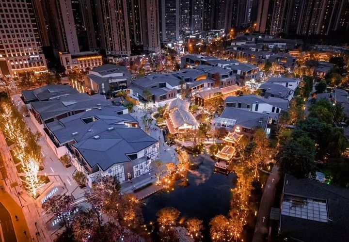 鐵像寺水街靠近明代古剎鐵像寺、依托肖家河濱水而建,新中式古典建筑風(fēng)格融合古塔、古橋、牌坊、川西林盤(pán)等天府文化元素,在鱗次櫛比的高樓大廈中辟出一片獨(dú)特的開(kāi)放式漫游空間。