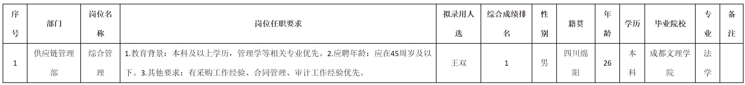 根據(jù)四川九州電子科技股份有限公司發(fā)布的招聘公告及招聘相關(guān)規(guī)定,經(jīng)測試、考察、體檢等程序,擬錄用王雙同志到四川九州電子科技股份有限公司工作,現(xiàn)予以公示,具體情況如下: