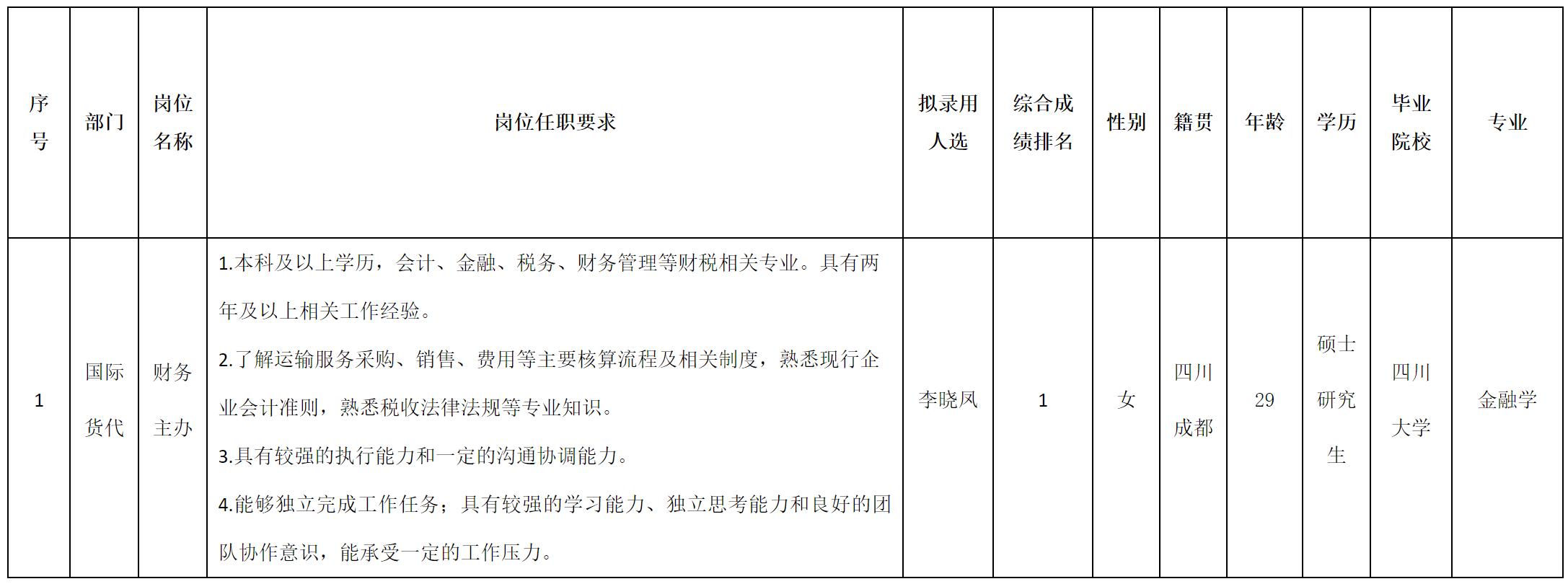 根據(jù)四川長虹民生物流股份有限公司發(fā)布的招聘公告及招聘相關(guān)規(guī)定,經(jīng)面試、考察、體檢等程序,擬錄用李曉鳳同志到四川長虹民生物流股份有限公司工作,現(xiàn)予以公示,具體情況如下: