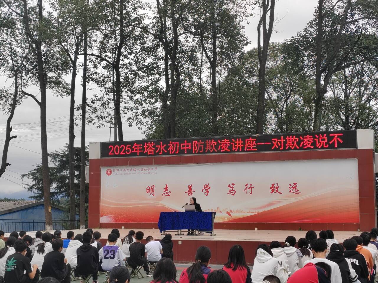 為了營(yíng)造和諧安全的校園環(huán)境,守護(hù)學(xué)生健康成長(zhǎng),10月17日上午,安州區(qū)塔水鎮(zhèn)初級(jí)中學(xué)在內(nèi)操場(chǎng)開(kāi)展了以“警校攜手筑防線,向校園欺凌‘亮劍’”為主題的2025年秋防欺凌主題教育講座活動(dòng),特別邀請(qǐng)?jiān)撔7ㄖ聘毙iL(zhǎng)、安州區(qū)人民法院孫洋法官擔(dān)任主講,為全校學(xué)生上了一堂生動(dòng)的法治教育課。
