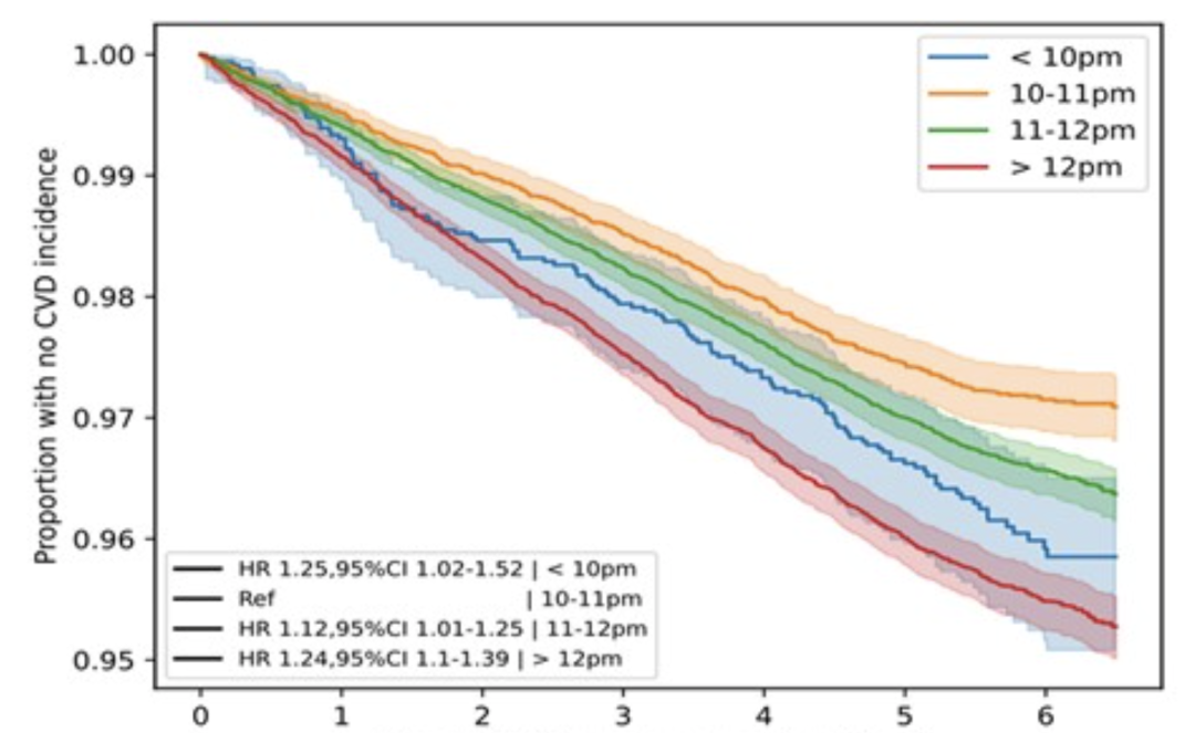 研究人員把這些人分成四組:晚上 10:00 前入睡、晚上 10:00~10:59 入睡、晚上 11:00~11:59 入睡和午夜后才入睡。然后,他們對(duì)參與者進(jìn)行了平均 5.7 年的隨訪,統(tǒng)計(jì)誰在這段時(shí)間里新發(fā)了心血管疾病(如心梗、中風(fēng)、心衰等)。