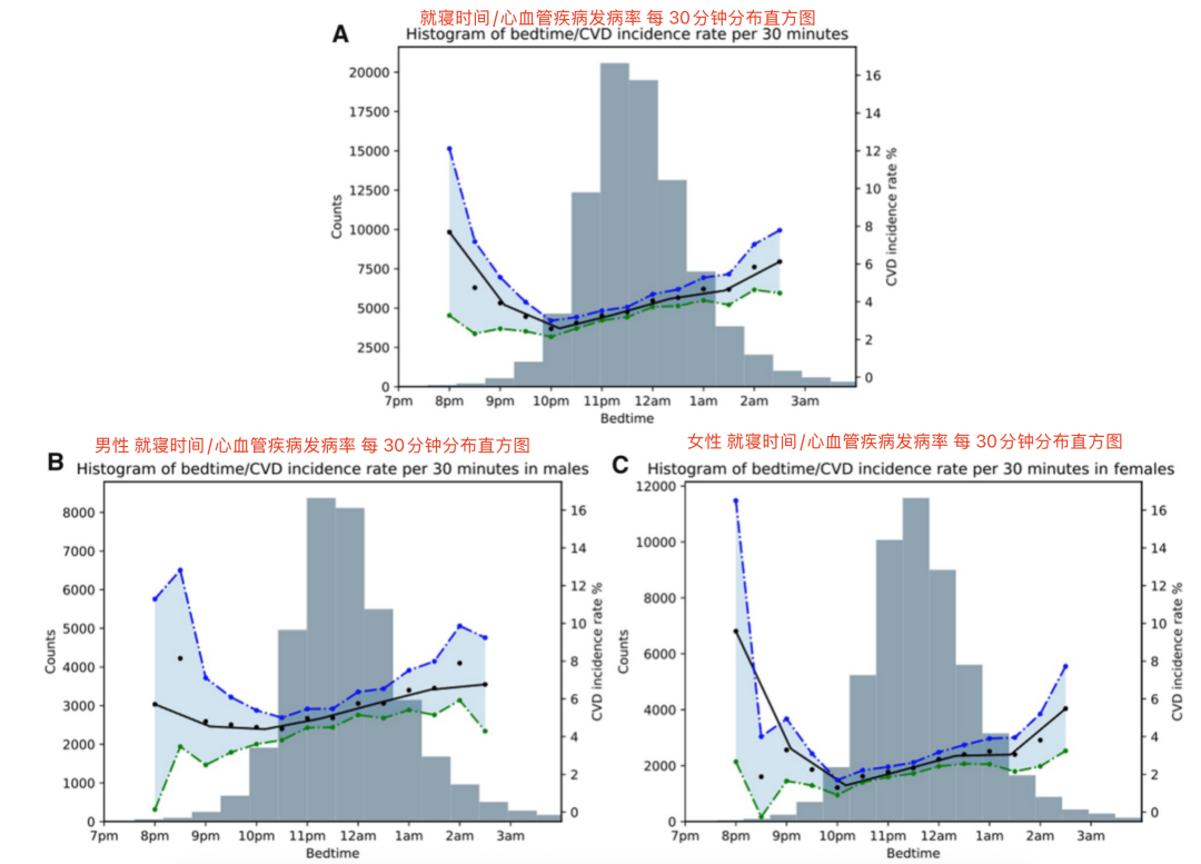 睡眠開始時(shí)間與心血管疾病發(fā)病率之間的關(guān)系,(A)總體樣本,(B)男性,(C)女性,圖源:參考文獻(xiàn) [1]