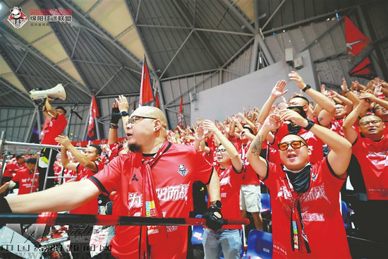 看臺上,為綿陽隊助威的旗陣“遍地開花”。