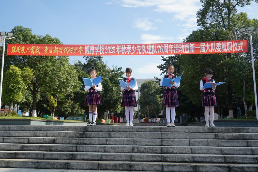 追隨著星星火炬的光芒,少先隊的大家庭里又融入了新鮮的血液。“今天,博雅學校又有一批新隊員加入少先隊這個光榮的組織,同學們的眼中滿是期待......,”大隊輔導員任越老師用充滿力量的聲音宣讀名單。