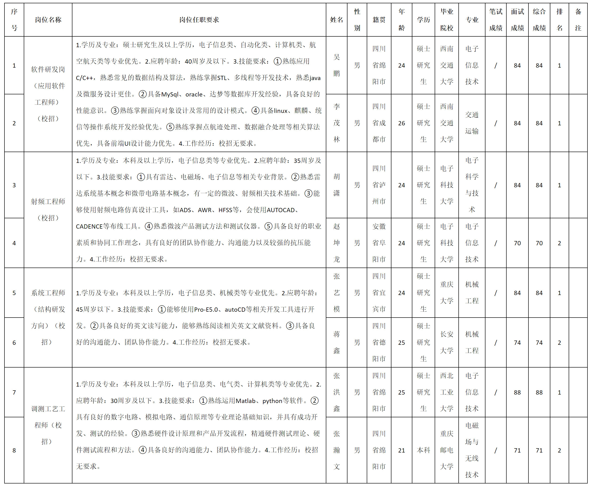 四川九洲電器集團有限責任公司關于招聘系統(tǒng)工程師(結構研發(fā)方向)(校招)等崗位測試成績的公示