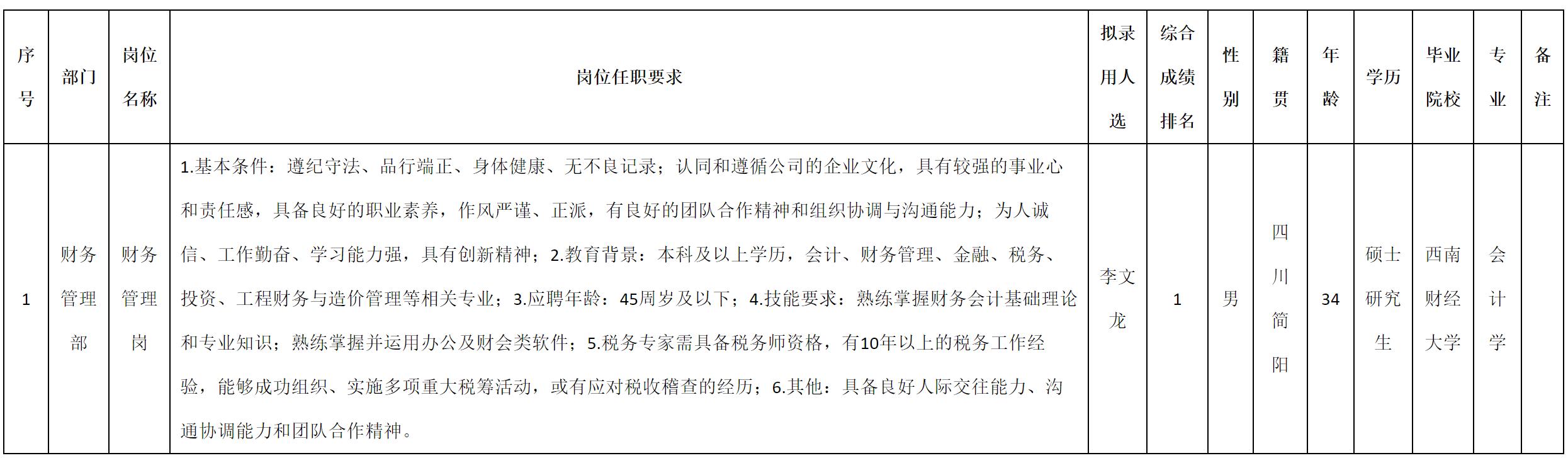 根據(jù)四川九洲投資控股集團(tuán)有限公司發(fā)布的招聘公告及招聘相關(guān)規(guī)定,經(jīng)測(cè)試、考察、體檢等程序,擬錄用李文龍同志到四川九洲投資控股集團(tuán)有限公司工作,現(xiàn)予以公示,具體情況如下: