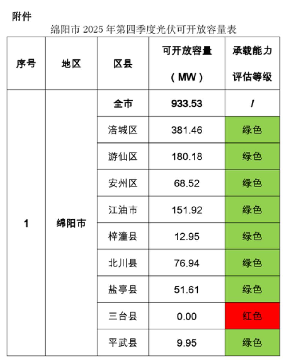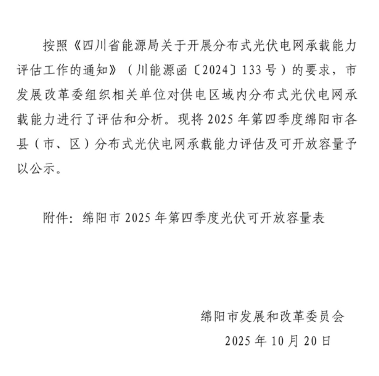 綿陽(yáng)市發(fā)展和改革委員會(huì)關(guān)于對(duì)2025年第四季度分布式光伏電網(wǎng)承載能力評(píng)估及可開放容量的公示